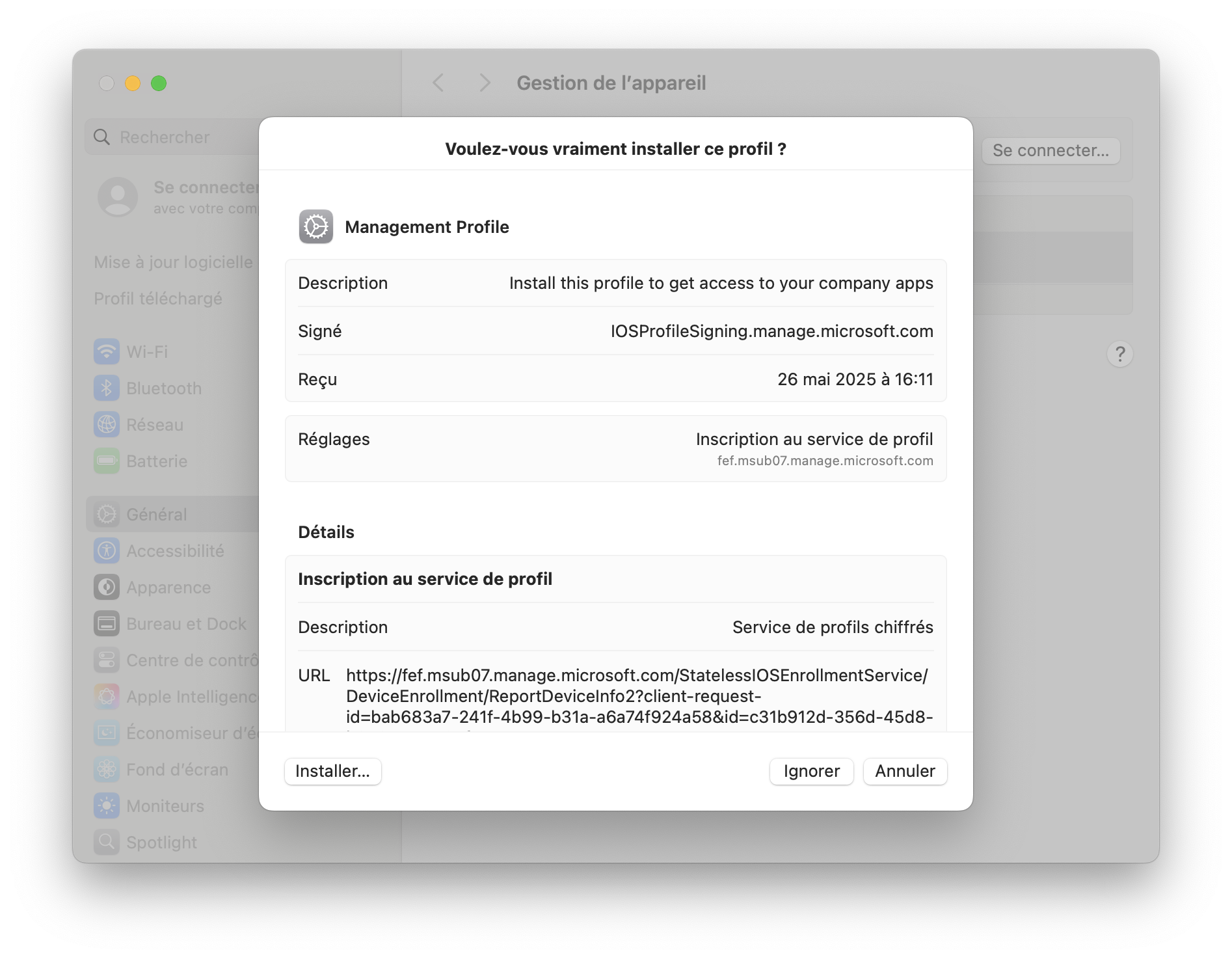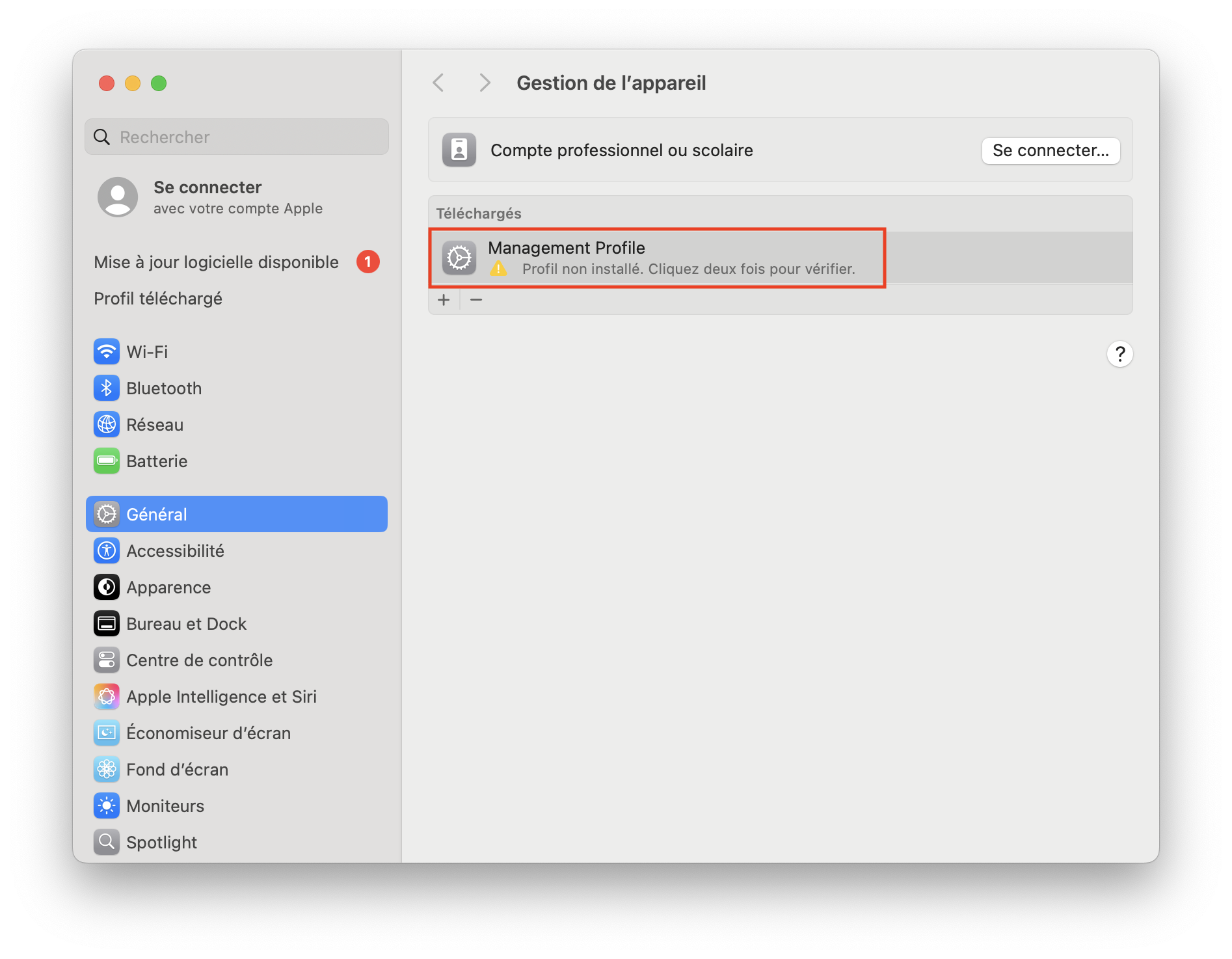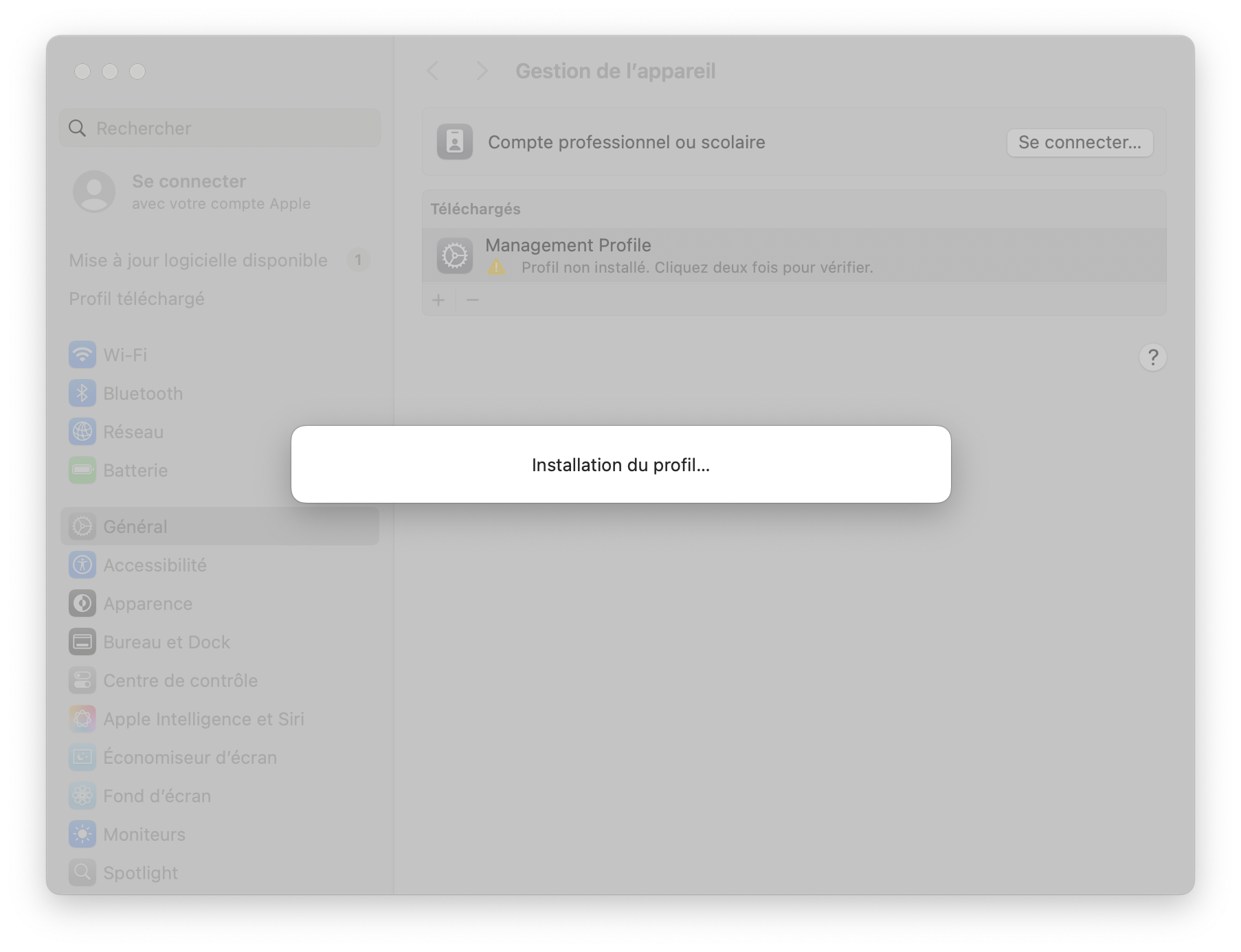 - Dans les Préférences Système, sélectionnez le profil téléchargé, puis cliquez deux fois sur Installer.