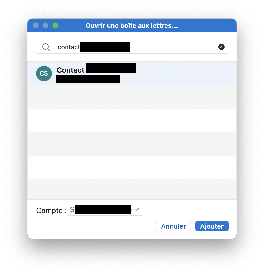 5. Saisir l’adresse e-mail de la boîte partagée (ex : contact@tondomaine.fr), assurez de bien avoir selectionner votre compte