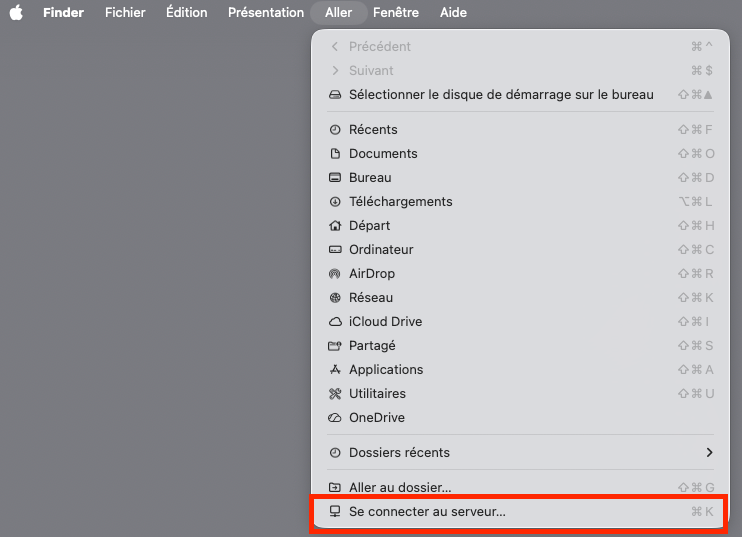 1. Dans le finder, se rendre dans "Aller" puis "Se connecter au serveur..."